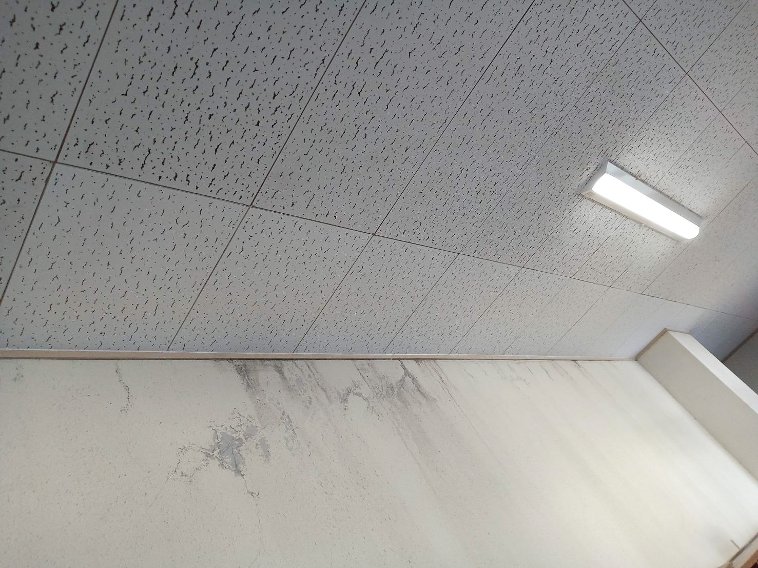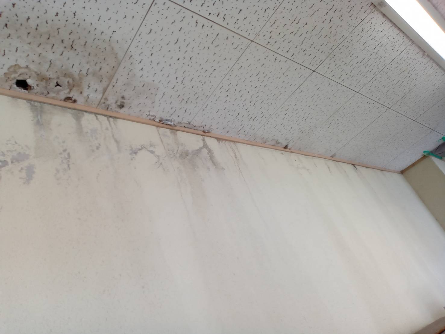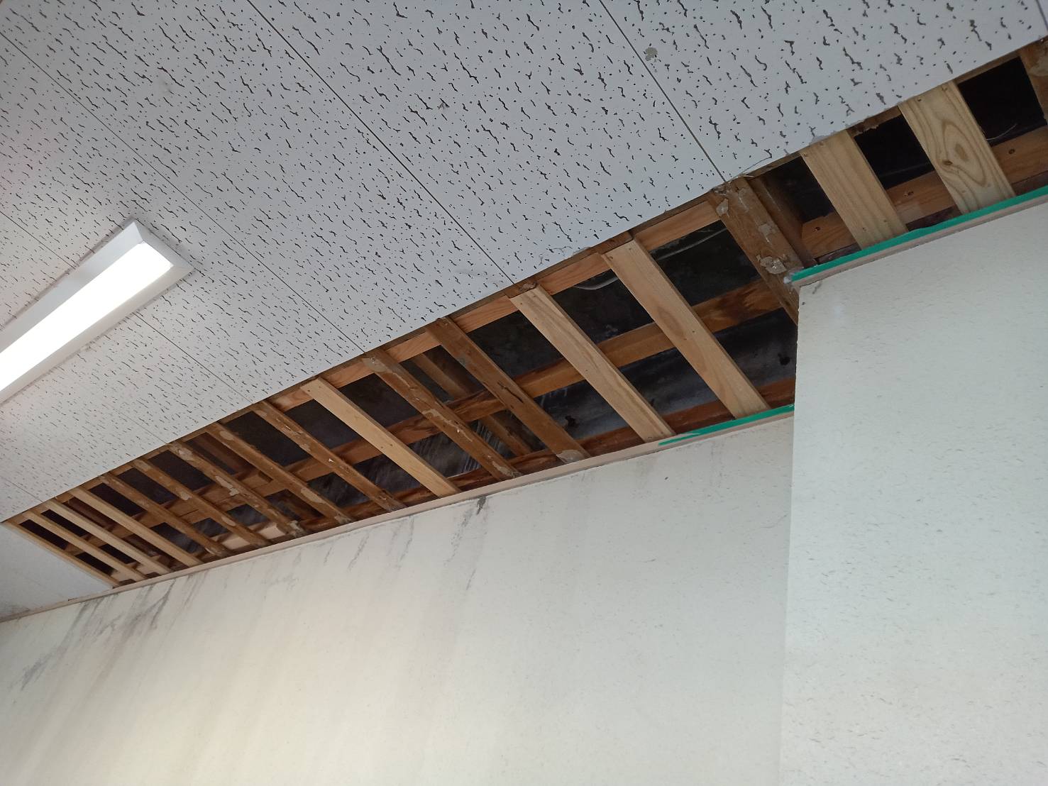 天井から雨漏りしていた箇所のみ解体し、下地補強をして軒天材料にて貼替えました。