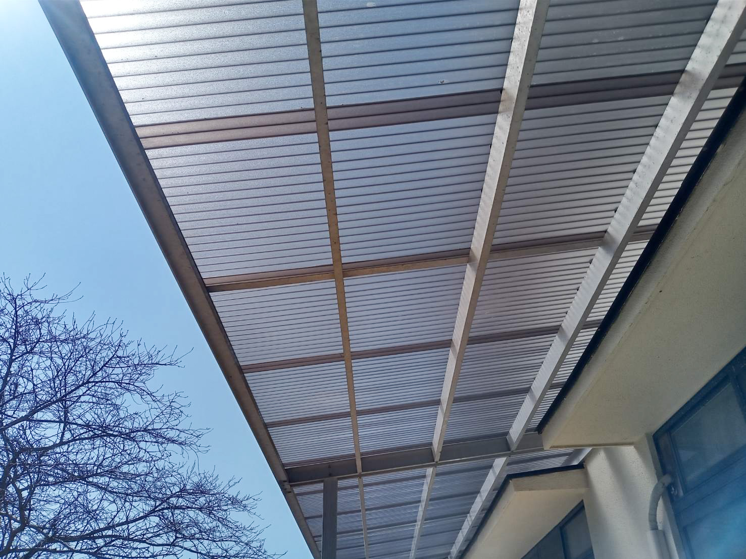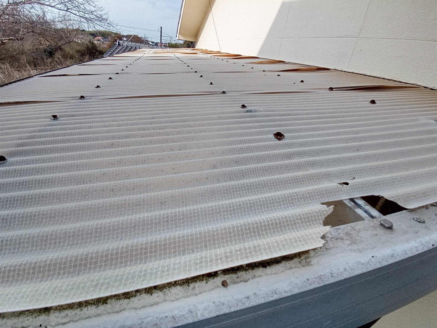 既存の波板を撤去した際に、壁面にてクラック補修をしてからポリカ交換を行いました。